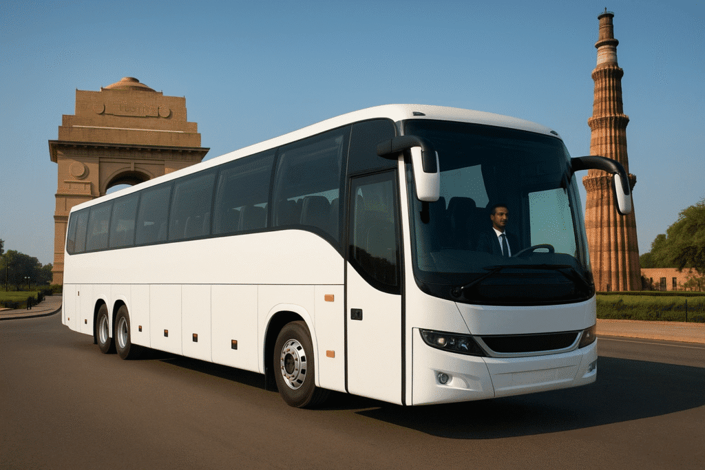 A premium touring coach featuring plush pushback seating, AC, large luggage storage, and a smooth ride experience. Ideal for large groups, events, schools, or corporate tours. Starting rate: ₹60/km. Ensures maximum comfort with safe and professional service.